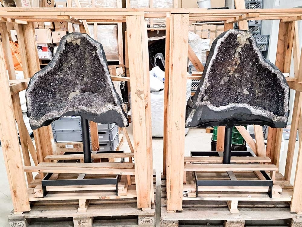 Dieses beeindruckende Amethystdrusen-Paar wurde zu einer faszinierenden Freiform verarbeitet,