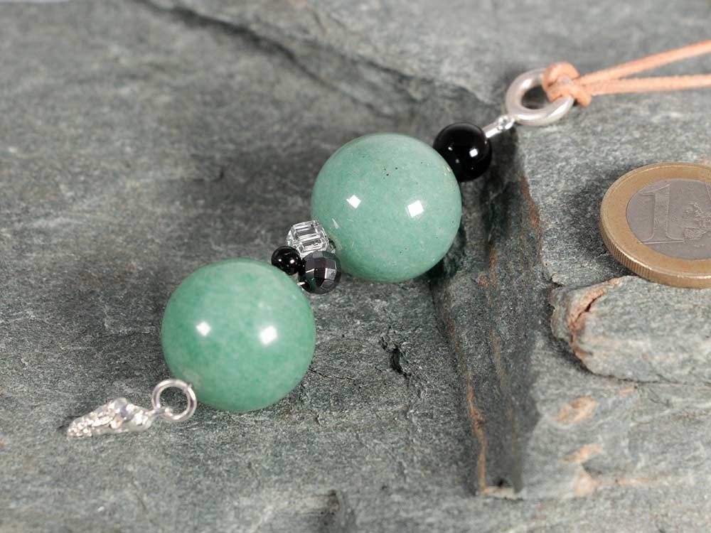 zwei Aventurinkugeln, kleinen Bergkristallen und Achatkugeln, ergänzt mit einem Silberteil in Muschelform.