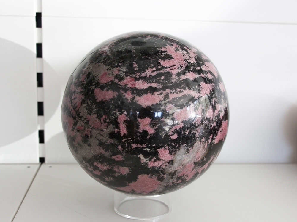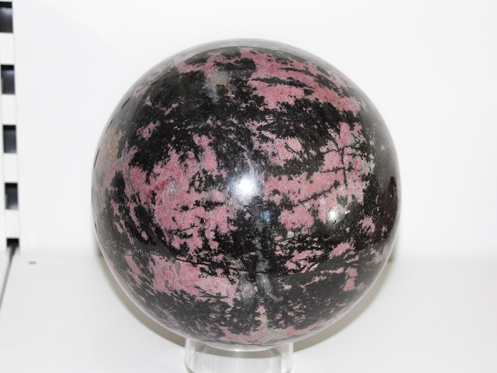 Eine sehr schöne, große Rhodonit Edelsteinkugel mit einer interessanten Farbgebung.
