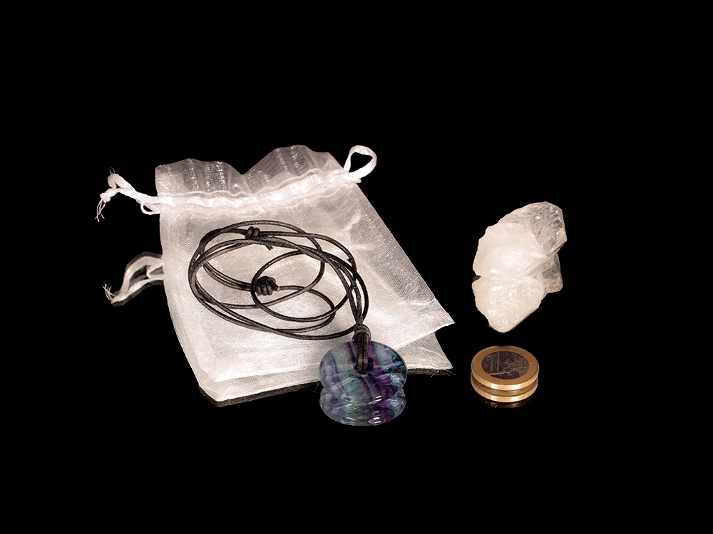 - Fluorit Donut mit Lederband - ein tragbarer Edelstein. Ihm wird nachgesagt, dass er laut Heilkunde innere Ordnung, mentale Klarheit und strukturiertes Denken unterstützen kann.