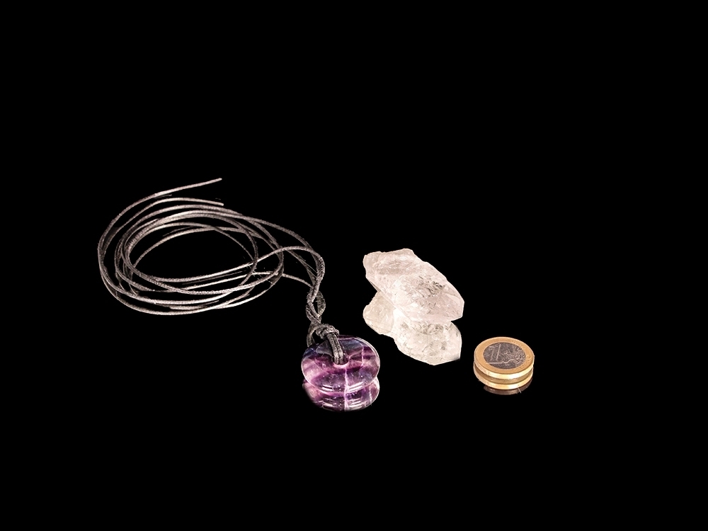 - Fluorit Donut als Anhänger mit Lederband, Bergkristall in Rohform