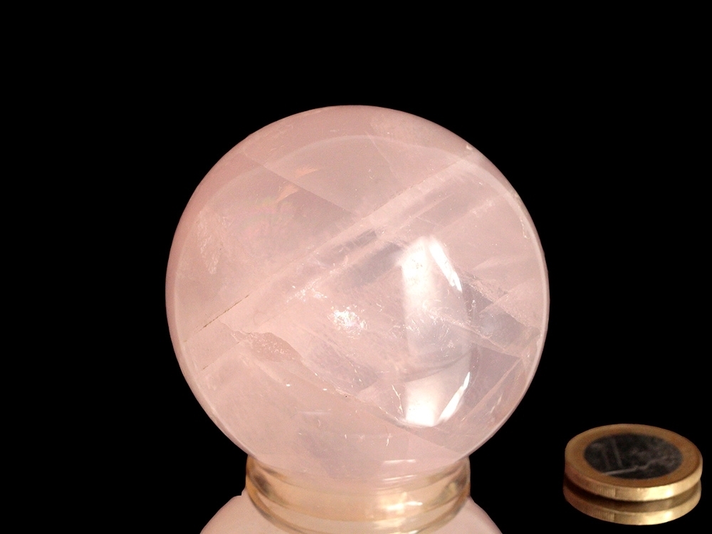 Diese Edelsteinkugel wurde aus einem sehr guten Rosenquarz geschliffen.