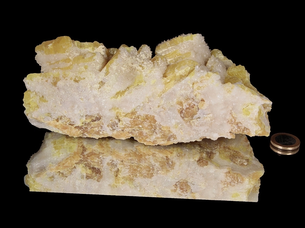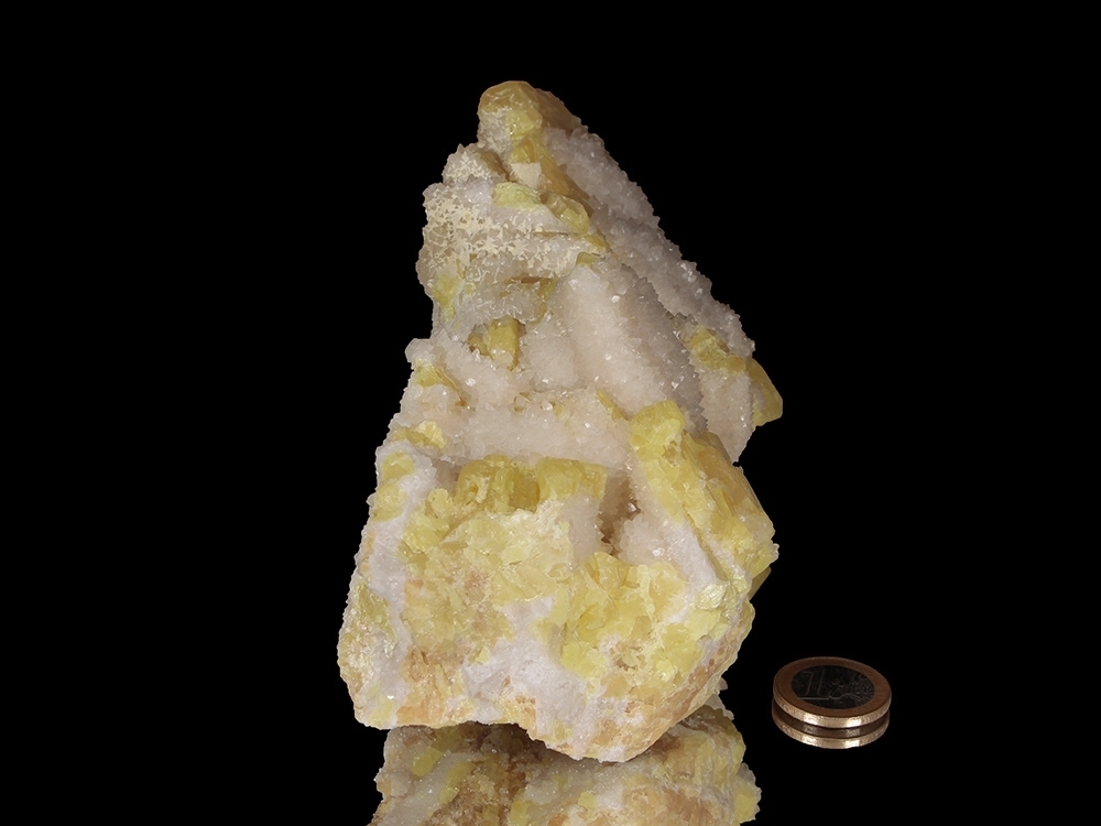 Eine beeindruckende Schwefel Kristallstufe mit glänzenden gelben und weißen Kristallen.