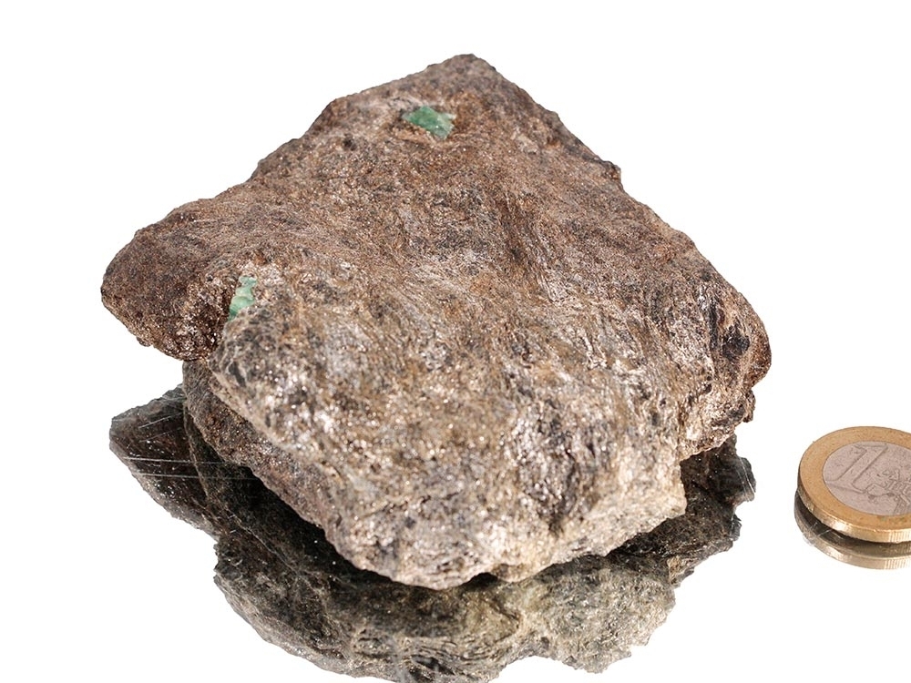 Der Smaragd (grün) ist hier auf Biotit gewachsen.