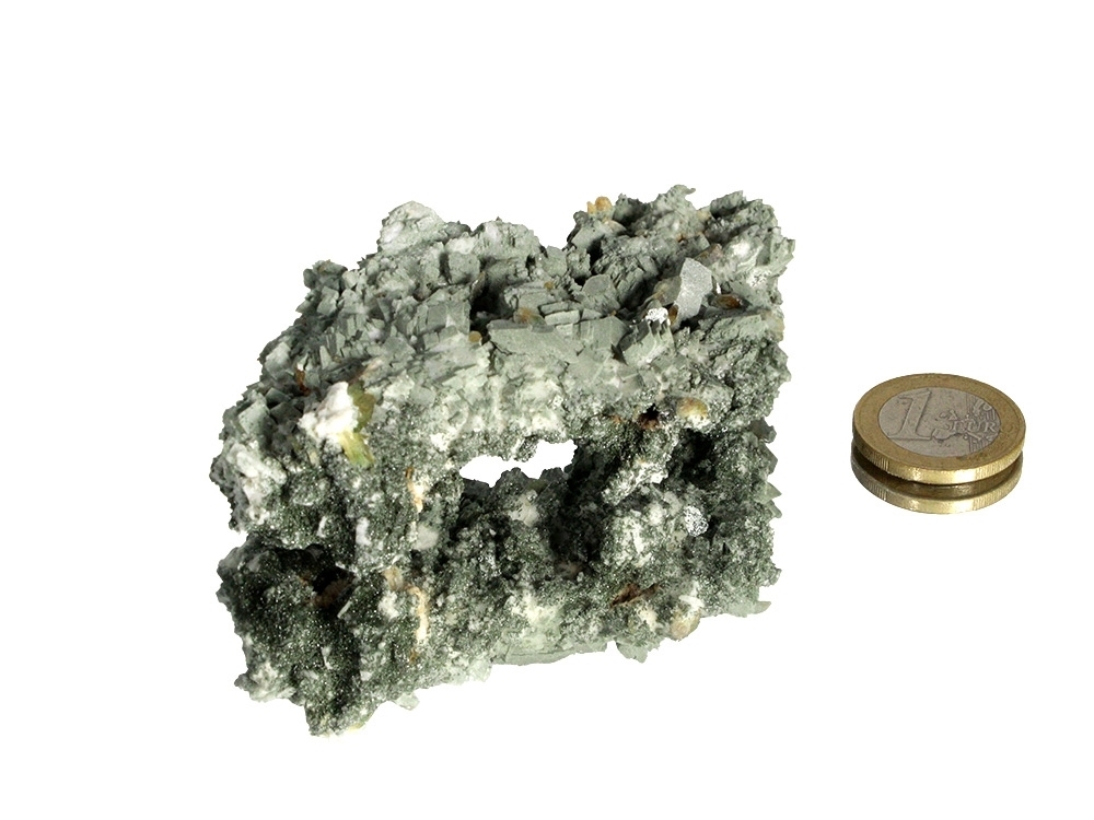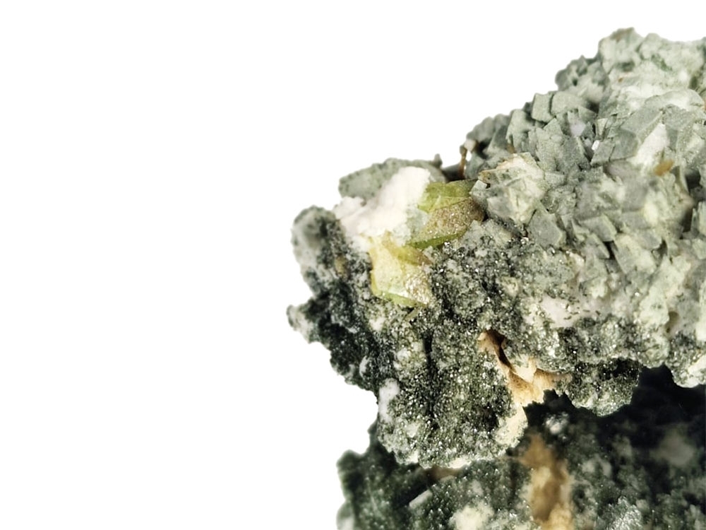Hier sind feine, grünliche Sphenkristalle auf einen Adular gewachsen und