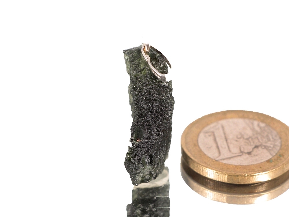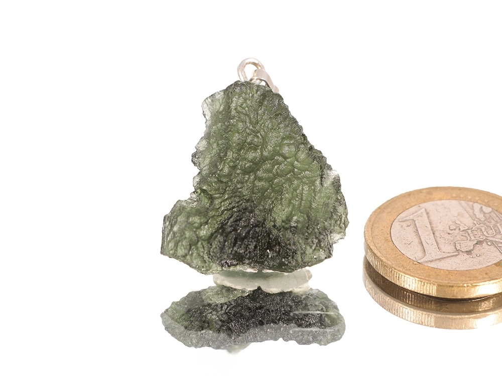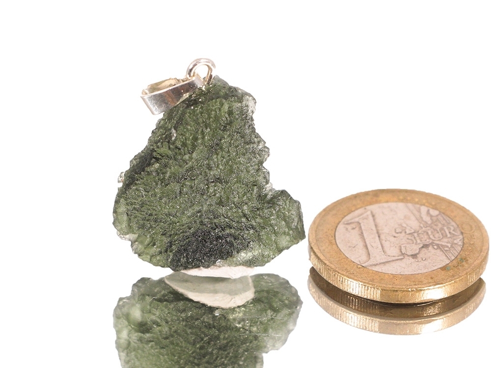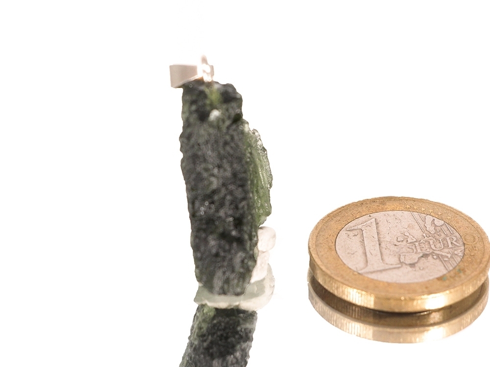 Der schöne Moldavit wurde zu einem Kettenanhänger mit Silberöse verarbeitet.