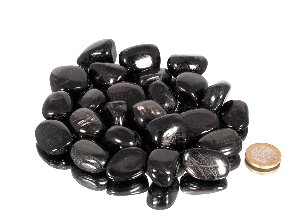 Die schön verarbeiteten und silber glänzenden Trommelsteine haben eine Größe von ca. 2 - 3 cm.