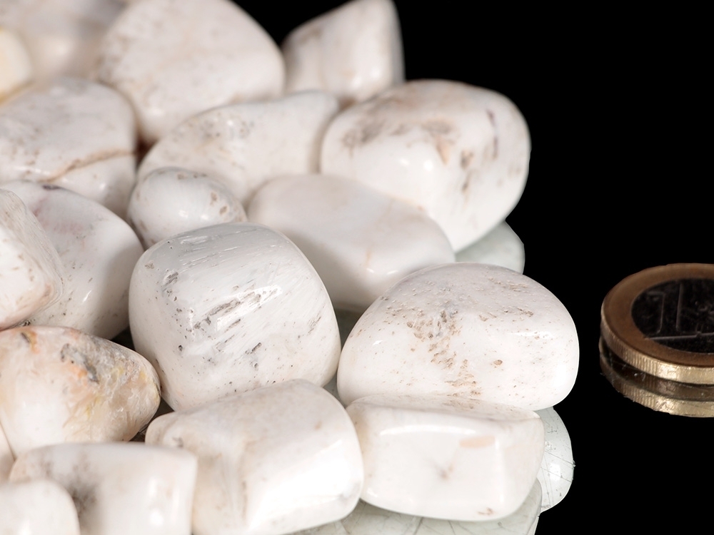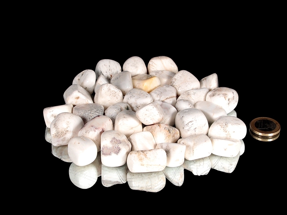 Skolezit Rohsteine wurden hier als Trommelstein / Handschmeichler geschliffen!