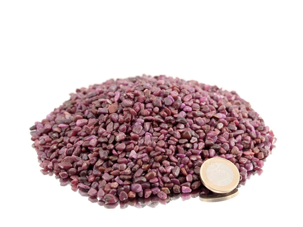Die Steine sind ca. 0,3 - 1 cm groß und matt (nicht glänzend, da sich Rubin nur sehr schwer trommeln und polieren lässt).