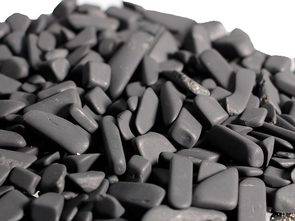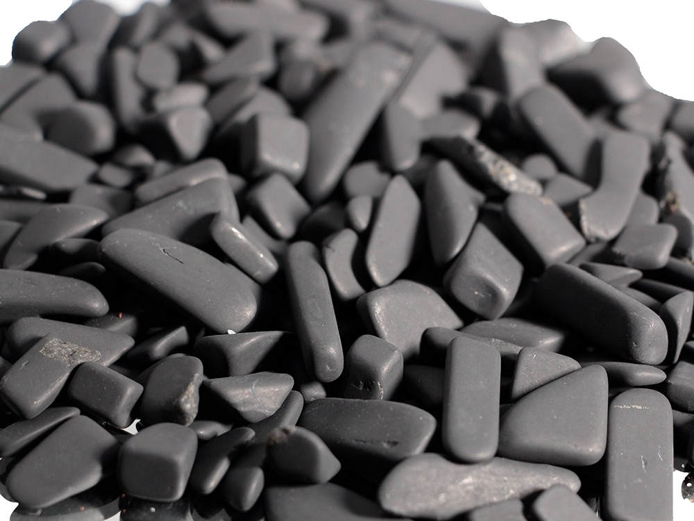 Kleine Trommelsteine wurden hier aus Schungit gerfertigt.