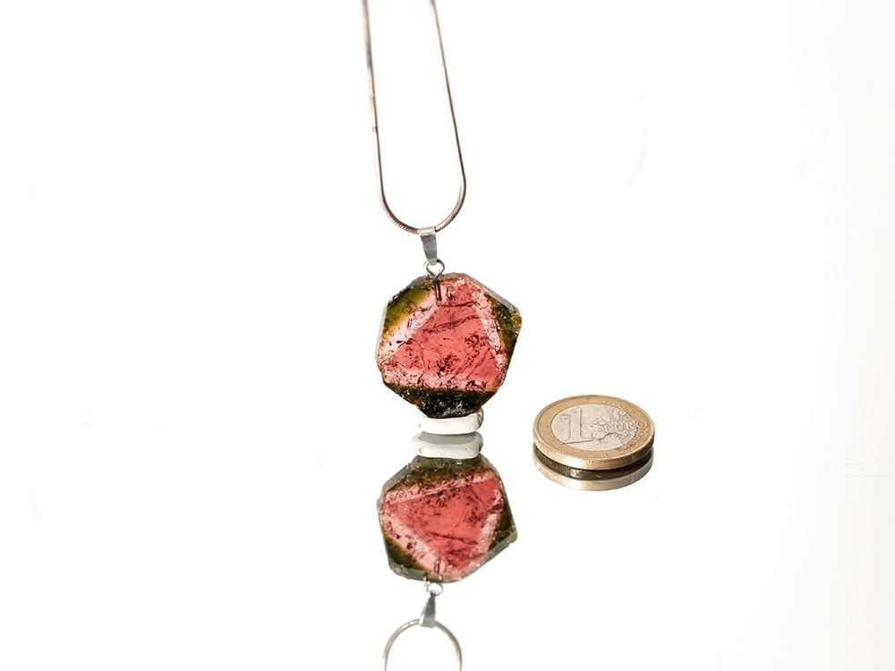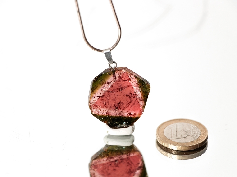 Dieser wunderschöne Turmalin Anhänger zeigt ein faszinierendes rotes Dreieck im Inneren des Steins,